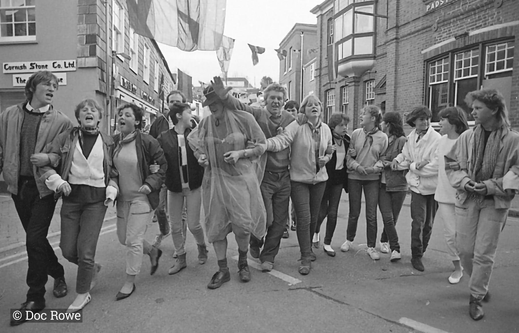 Date 1 May, 1985 Location Duke Street Subjects Merrymaking Music Dancing Costumes Kids Flags Shops People Becky O'Hagan Jackie McOwen Redfern Karen Hawke Tony Allen